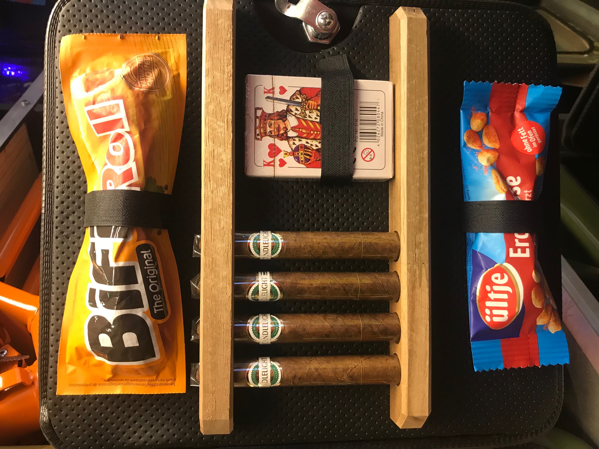 Die Türverkleidung ist eines der Highlights unserer Kanister. Sie wird mit dem Laser geschnitten und mit dem gleichen Material wie der Innenraum bezogen und bietet Platz für unterschiedliche Produkte. Der Klassiker ist die Nüsse, Zigarren und Spielkarten-Kombination. Es gibt aber auch die Nichtraucher-Variante, die Reagenzglas-Verkleidung, den BiFi-Kanister oder die Combat-Verkleidung mit der Makarov.