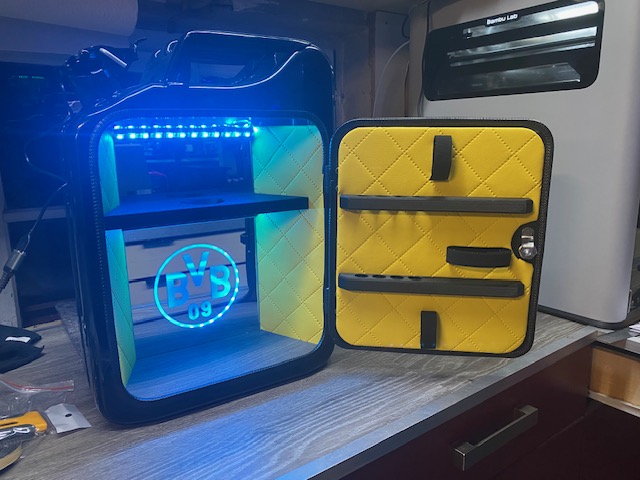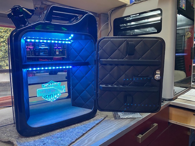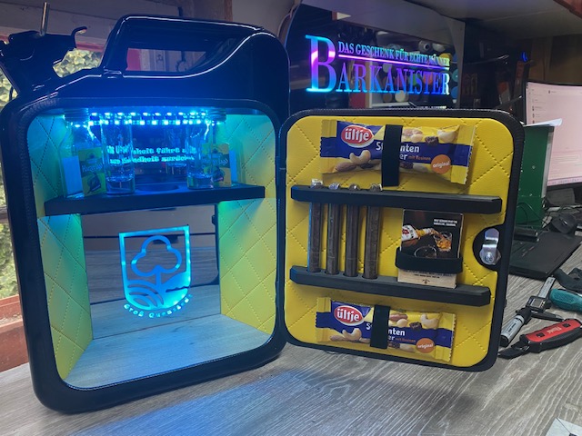 Die Spiegel im Kanister können gern mit einem Logo und/oder einer Widmung versehen werden. Diese werden mit einem Laser in den Spiegel geschnitten und anschließend schwarz lackiert oder mittels LED`s hinterleuchtet. Interessiert? Schreibt mir per WhatsApp oder nutzt den Kanisterbaukasten. Am besten lassen wir Bilder Sprechen: