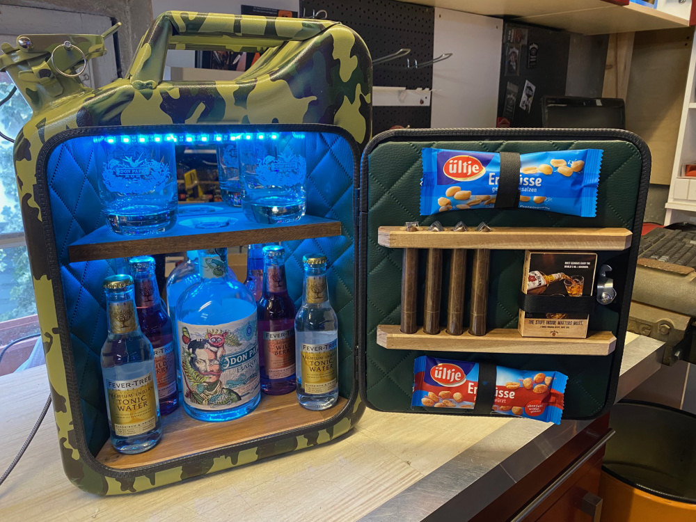 Ich verarbeite nur fabrikneue Stahlblechkanister. Die Größe eines 20 Liter Kanisters beträgt 47cm x 35cm x16cm (H x B x T), das Gewicht ohne Flaschen, Gläser etc. ca 8 kg. Die Rückwand innen besteht aus Echtglasspiegeln, neben dem perforierten PU-Leder ist echtes Akazienholz verbaut. Die Scharniere bestehen aus Zinkdruckguss und Edelstahl und sorgen zusammen mit dem voll umlaufenden schwarzen Kederband für ein kompaktes modernes Aussehen sowie Sicherheit und Langlebigkeit.